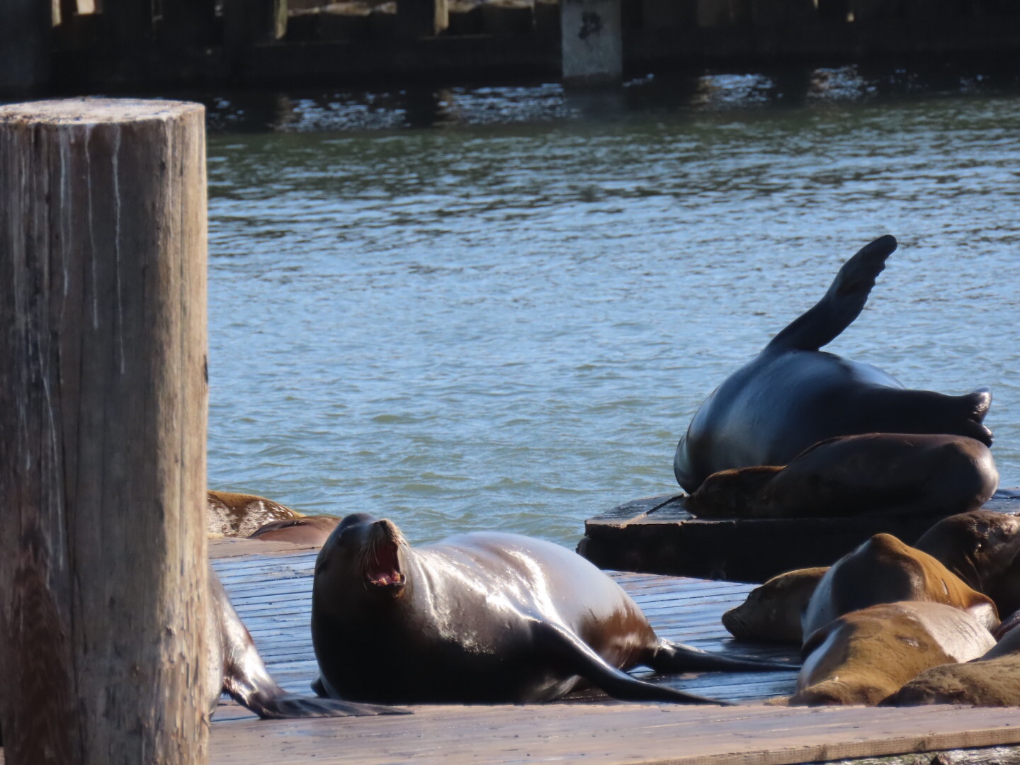 Na het inchecken zijn we nog even naar Fishermans Wharf gewandeld. Een gezellig toeristisch gebied waar veel restaurantjes en souvenirshops zitten. Er was veel muziek op straat en de zeeleeuwen op Pier 39 zongen ons toe. Een hele leuke ervaring. Het schijnt zelfs dat er normaal gesproken nog veel meer zeeleeuwen bij de pier liggen alleen veel gaan er in de zomer naar het zuiden zwemmen om daar te paren. Gelukkig zijn er ook zeeleeuwen die gewoon blijven, zodat wij ze konden bewonderen.