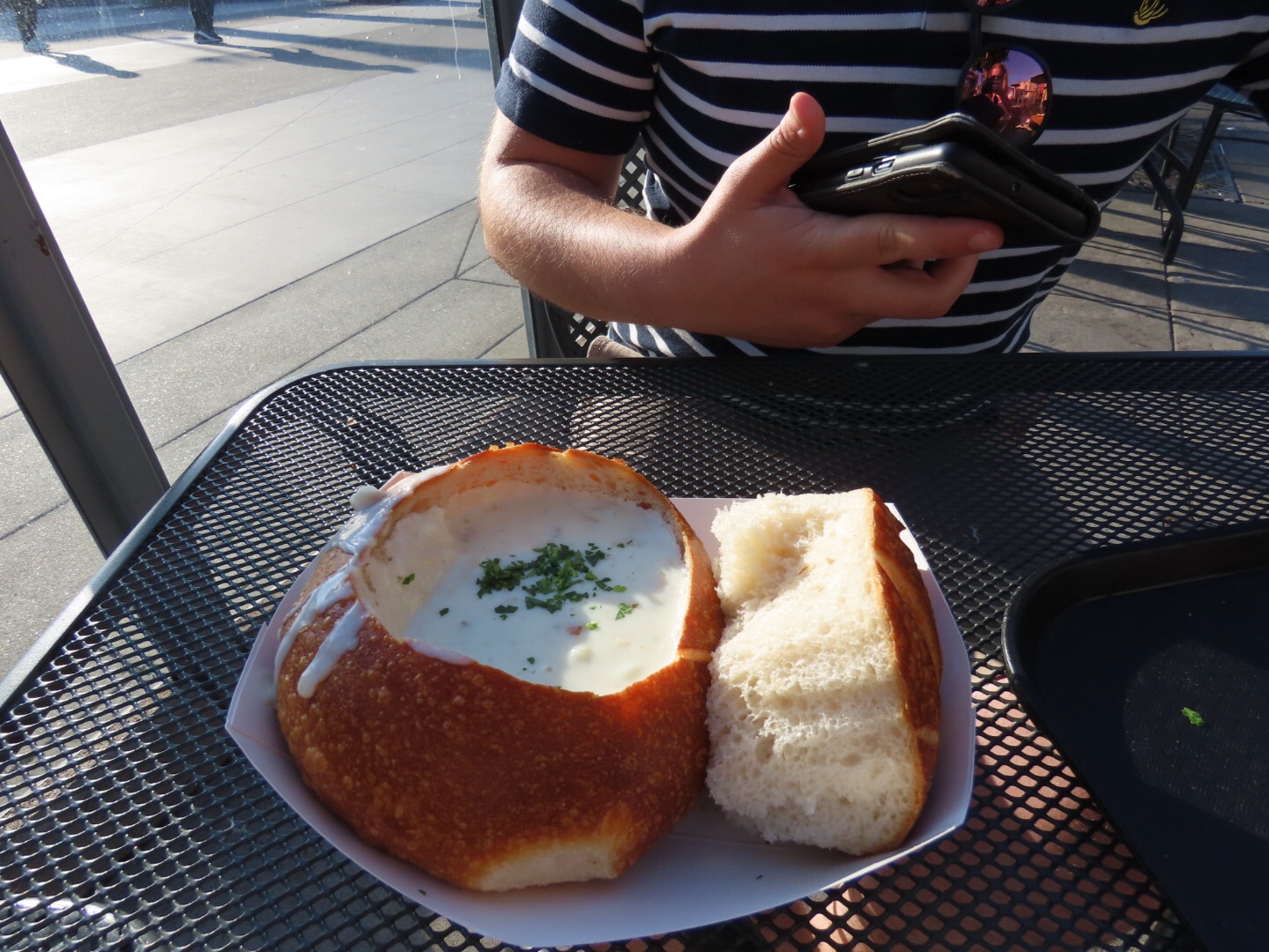 Toen zijn we terug gewandeld nadat we eerst nog even onze eerste ‘avondmaaltijd’ hadden gescoord (ons dagritme is helemaal verstoord, ook doordat we in het vliegtuig eigenlijk ook al avondeten hebben gehad). Yannick heeft bij Boudin Bakery zijn eerste traditionele maaltijd al achter de kiezen. De Clam Chowder was niet zijn favoriet maar echt vies was het ook niet want de schaal was gewoon leeg. Michelle koos voor de Grilled Cheese Sandwich, eigenlijk gewoon een tosti, lekker!