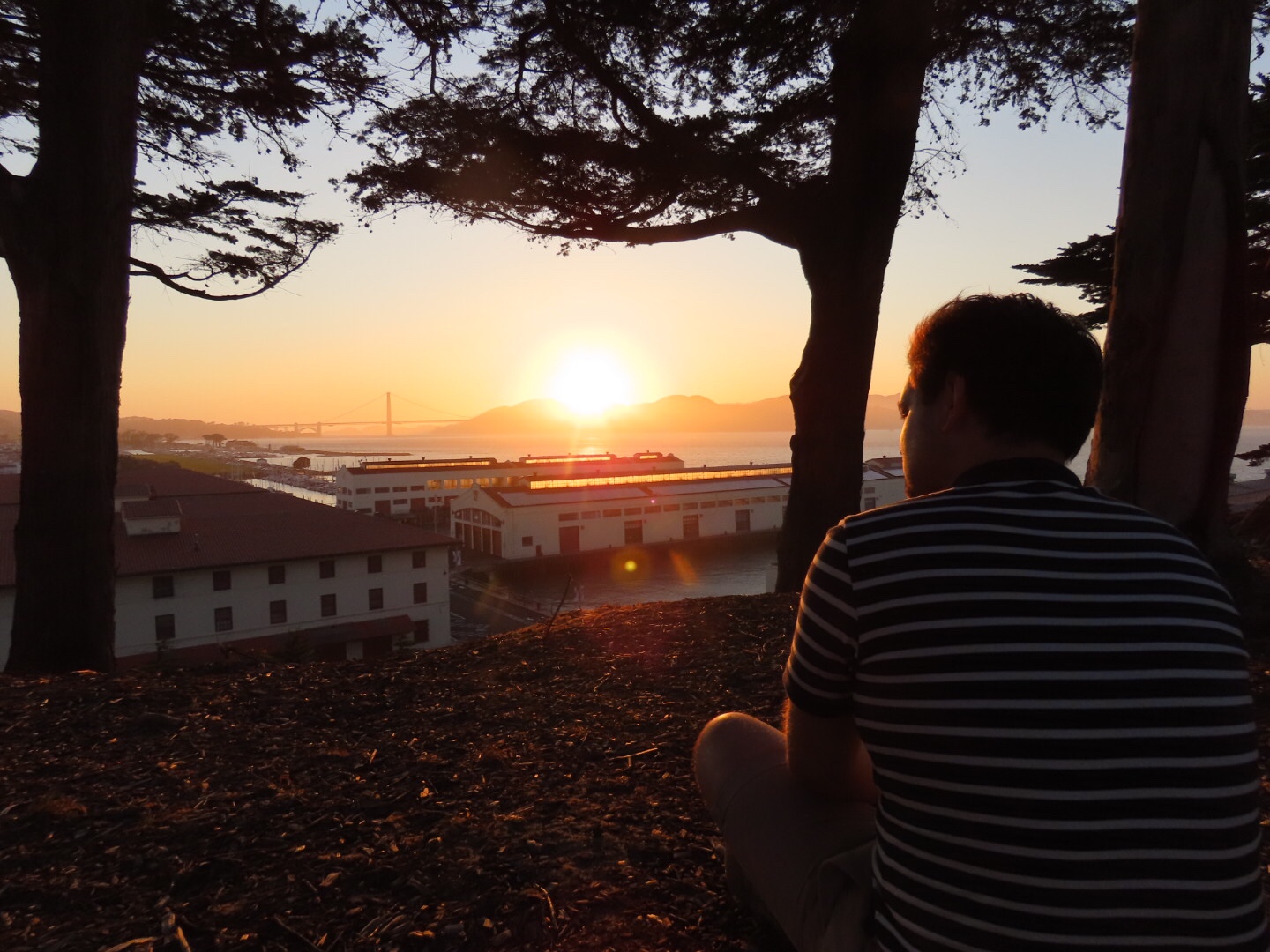 En hoe kun je eerste dag in de VS beter afsluiten dan met een zonsondergang met uitzicht op de Golden Gate Bridge. Ons hostel ligt vrij hoog en heeft een vrij uitzicht op de Golden Gate Bridge. Dus rond zonsondergang zijn we nog even lekker buiten gaan zitten en zagen we de zon achter de bergen zakken. Nu nog even proberen wakker te blijven om zo de jetlag tegen te gaan.