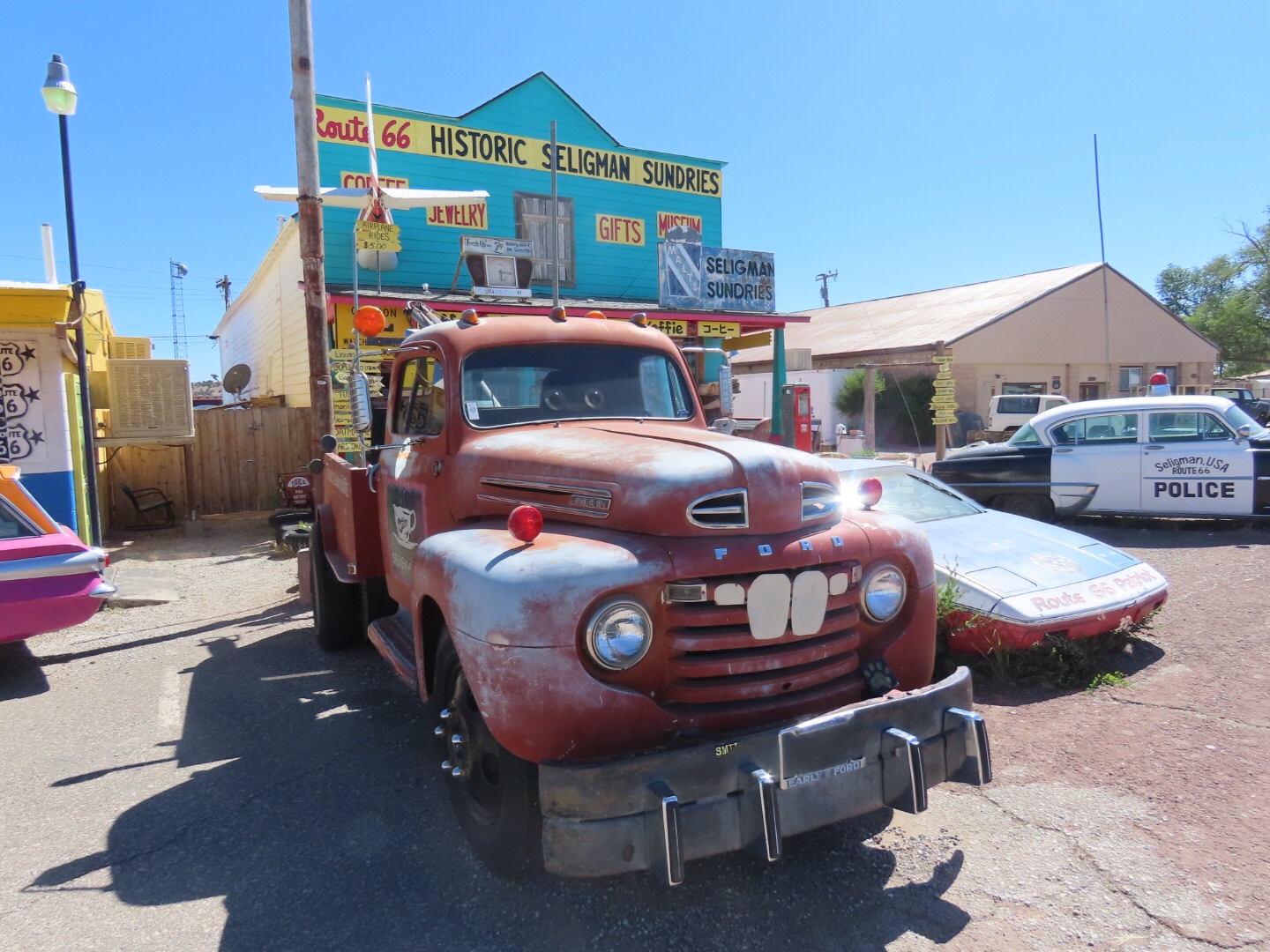 Onze volgende stop was Seligman, een vervallen en oud dorpje met nog wat leuke winkeltjes en musea over Route 66. Dit dorp is net als vele andere langs de oude Route 66 na het wegvallen van de route in verval gekomen en moet het nu nog vooral hebben van een handjevol toeristen die voorbij komen.