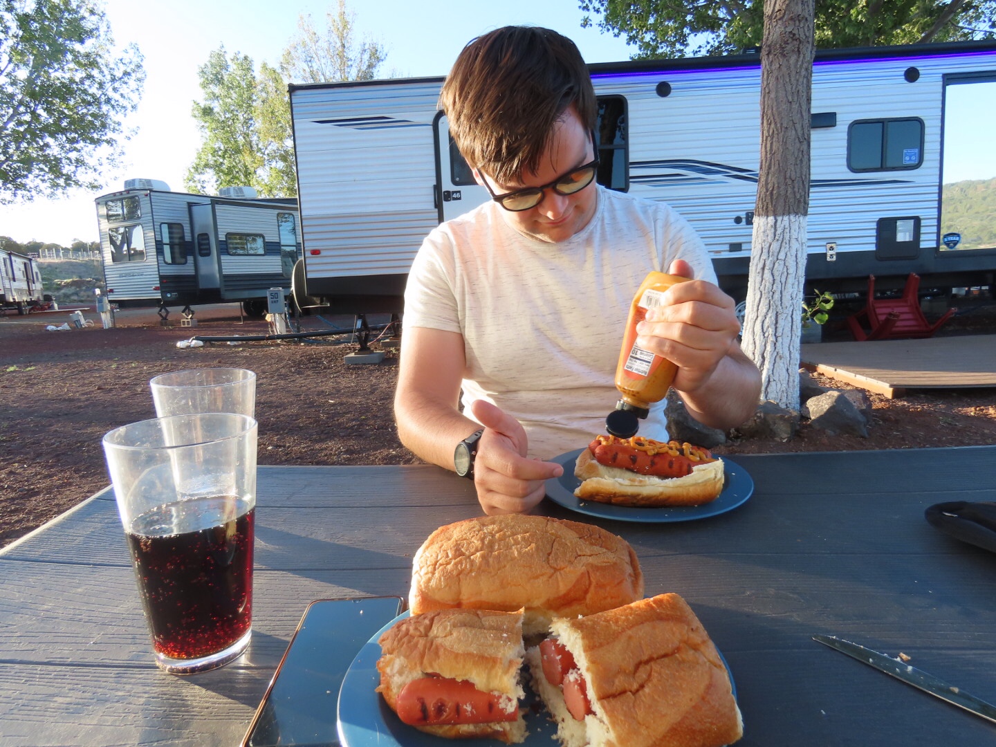 Na nog een half uurtje kwamen we aan in Williams (geen connectie met het F1 team), waar we de komende 2 nachten zullen slapen in onze camper/RV. Ons huisje op wielen is nog groter dan sommige hotelkamers die we hebben gehad en het is fijn om een keer te kunnen koken en een keukentje en bank te hebben. Ook kunnen we heerlijk buiten zitten op ons ‘deck’. Yannick heeft voor het avondeten vandaag wat worstjes op de BBQ gedaan, en met nog wat broodjes de we hadden hebben we zo lekkere hotdogs gegeten.