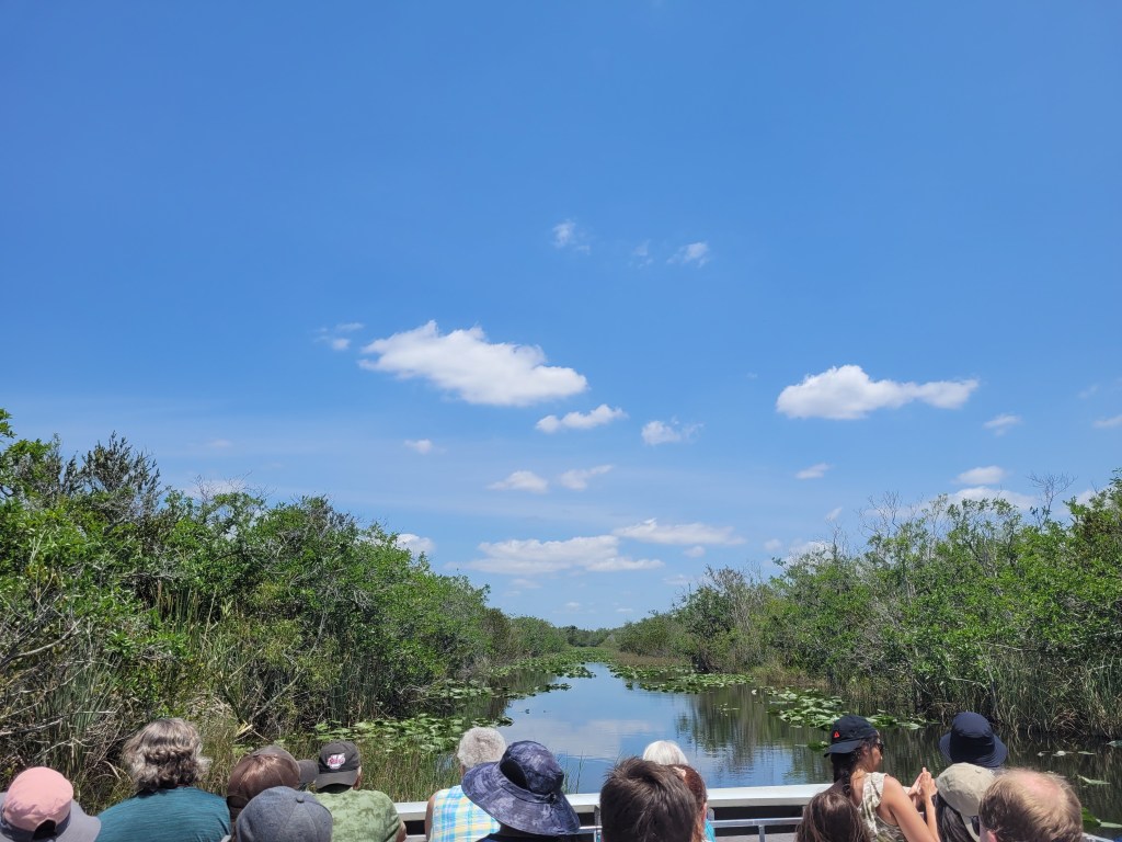 Gelukkig hoefden we niet 4 uur achter elkaar te rijden, want we hadden halverwege nog een stop op de planning. Bij het Everglades Safari Park hebben we een airboat tour gedaan, een airboat is zo’n boot met een mega propeller achterop. Het leuke was dat dit een van de weinige operators is die door de National Park Service is aangewezen om in de Everglades te mogen varen. Na ongeveer 10 minuutjes wachten gingen we al van start. De tour op de boot duurde ongeveer 30 minuutjes. We hebben een paar alligators kunnen spotten. Sommige wat groter, anderen wat kleiner. Soms ging de boot best wel hard, dus je moest goed oppassen dat je niet uit je vestje waaide.