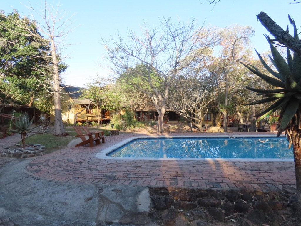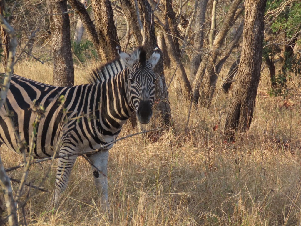 We liepen weer een stukje verder en kwamen weer een Nyala tegen. Net voordat we weer bij de lodge waren kwamen we nog een hele groep zebra’s tegen. We konden er erg dichtbij komen, wat super gaaf was! Daarna kwamen we ze nog een keer tegen, op de parkeerplaats van onze lodge. Op onze auto zaten apenpootafdrukken en we zagen daar ’s middags nog zwijntjes. Veel activiteiten dus rond ons!