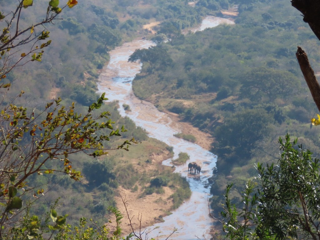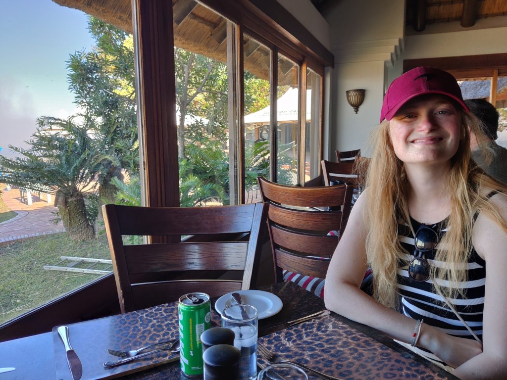 Bij het uitchecken gaf de dame ons als tip om het Hluhluwe park (spreek uit als sjusjuwie) alvast mee te nemen op de route. Hier zouden we lekker kunnen lunchen en ook dieren spotten onderweg. Dus wij pasten onze route wat aan en onderweg waren we weer. Na ongeveer 2 en een half uur kwamen we aan bij de gate van het park. Het is een vrij dichtbegroeid park, dus helaas op wat olifanten in de verte hebben we geen dieren kunnen spotten. Ook het restaurant was niet top, we hebben er geluncht en het was een mooi uitzicht maar de mensen waren amper te verstaan en er was iets van stroomuitval waardoor ze veel niet konden leveren.