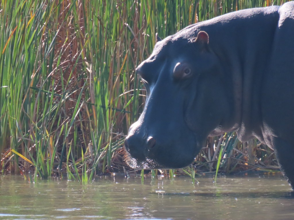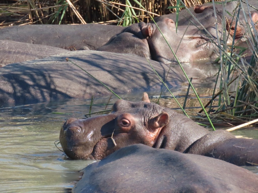 We zagen nog verschillende andere nijlpaarden families, in het water, uit het water, klein en groot. Onze skipper kon er ook veel over vertellen. Zo vertelde hij dat nijlpaarden eigenlijk niet zo goed kunnen zwemmen. Daarom zijn ze vaak aan de kant te vinden omdat ze daar dan lekker kunnen dobberen. In de Afrikaanse winter (dat is nu) reageren ze vaak op de zon. Dus in het begin van de ochtend zijn ze aan de ene kant van de oever en op een gegeven moment verplaatsen ze naar de andere kant. Nijlpaarden zijn territoriale dieren en hebben vaak 1 dominant mannetje in de familie. Als kleine mannetjes een jaar of 4 zijn verlaten ze de familie en gaan ze vaak eerst in een bachelor groepje leven. Als ze oud en sterk genoeg zijn gaan ze op zoek naar een nieuwe familie en dagen ze de dominante man van een familie uit voor een gevecht. Zo komen veel mannelijke nijlpaarden aan hun einde, door met andere mannetjes te vechten.