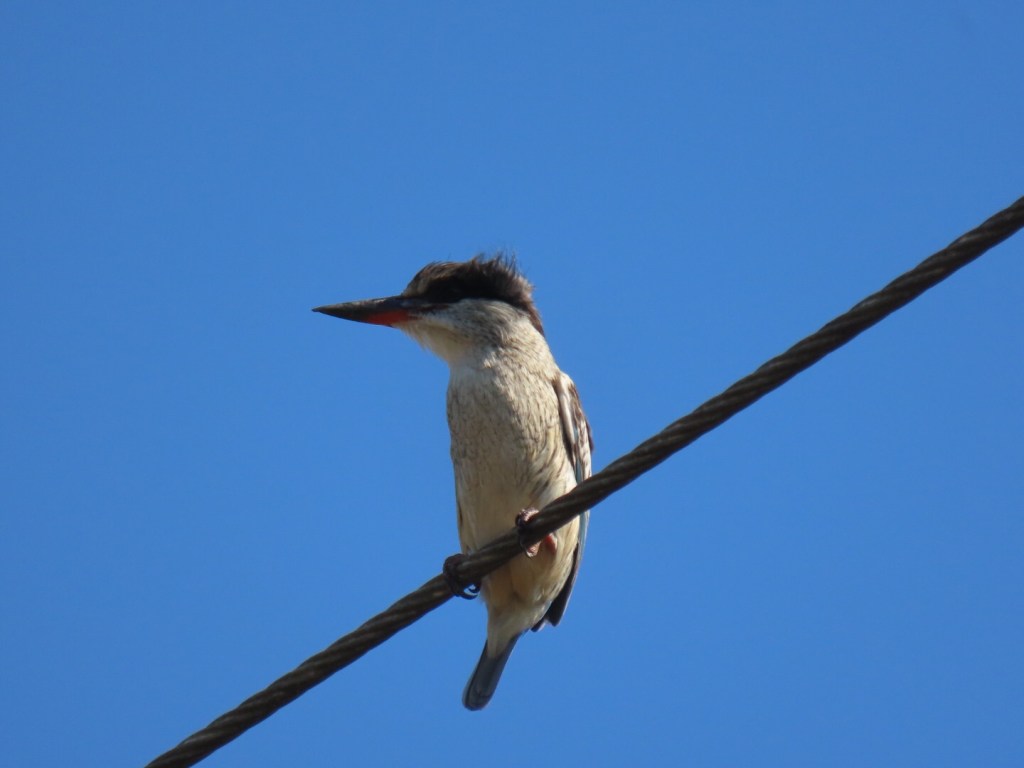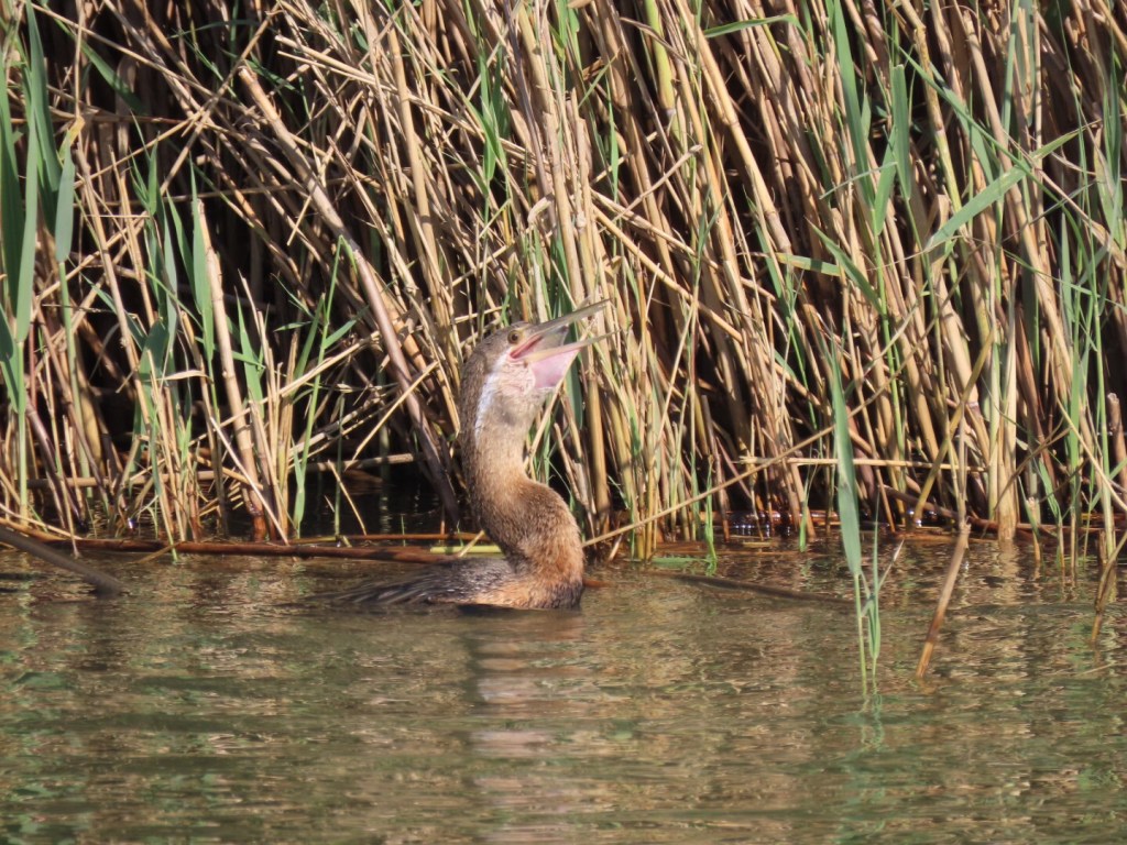 We zagen nog een aalscholver met een visje in zijn bek. Het visje wilde alleen niet naar binnen dus hij stond de hele tijd dat wij hem zagen met zijn kop in de lucht en het uiteinde van de vis hing nog uit zijn snavel, proberende om de vis door zijn lange, slanke keeltje te krijgen. Het was een erg grappig gezicht!