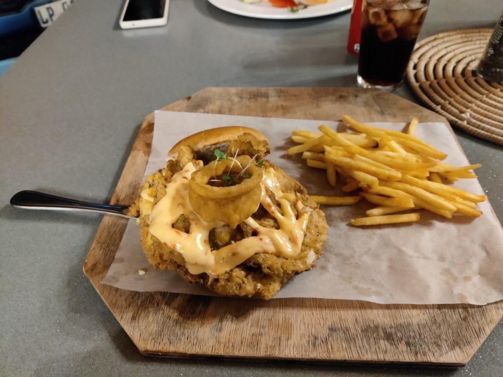 Eenmaal terug hebben we ons nog even opgefrist en hebben we weer bij Dune and Reef gegeten. Dit keer gingen we voor de burgers. Yannick een kipschnitzel variant, Michelle de cheeseburger (verrassing). Ze smaakte prima en na een milkshake (Yannick de rumrozijnen en Michelle de oreo) gingen we met volle buikjes weer terug naar onze lodge. Morgen moeten we vroeg op, dus snel naar bed!