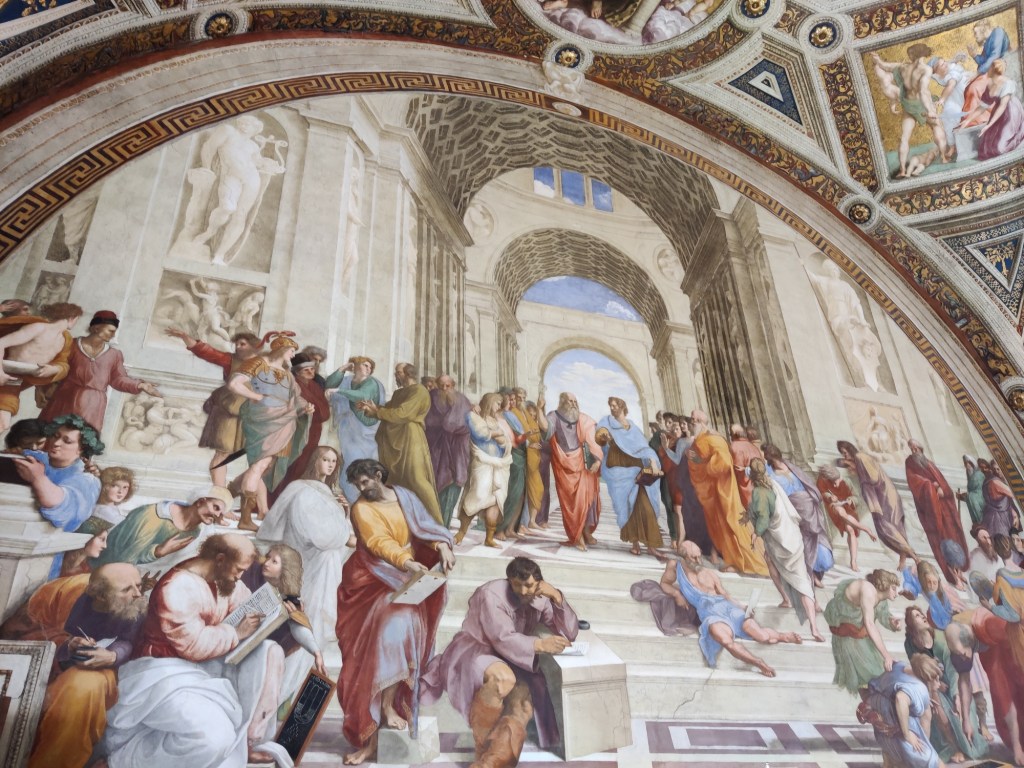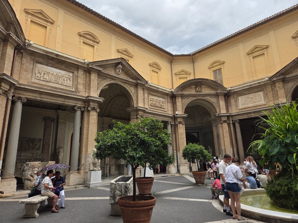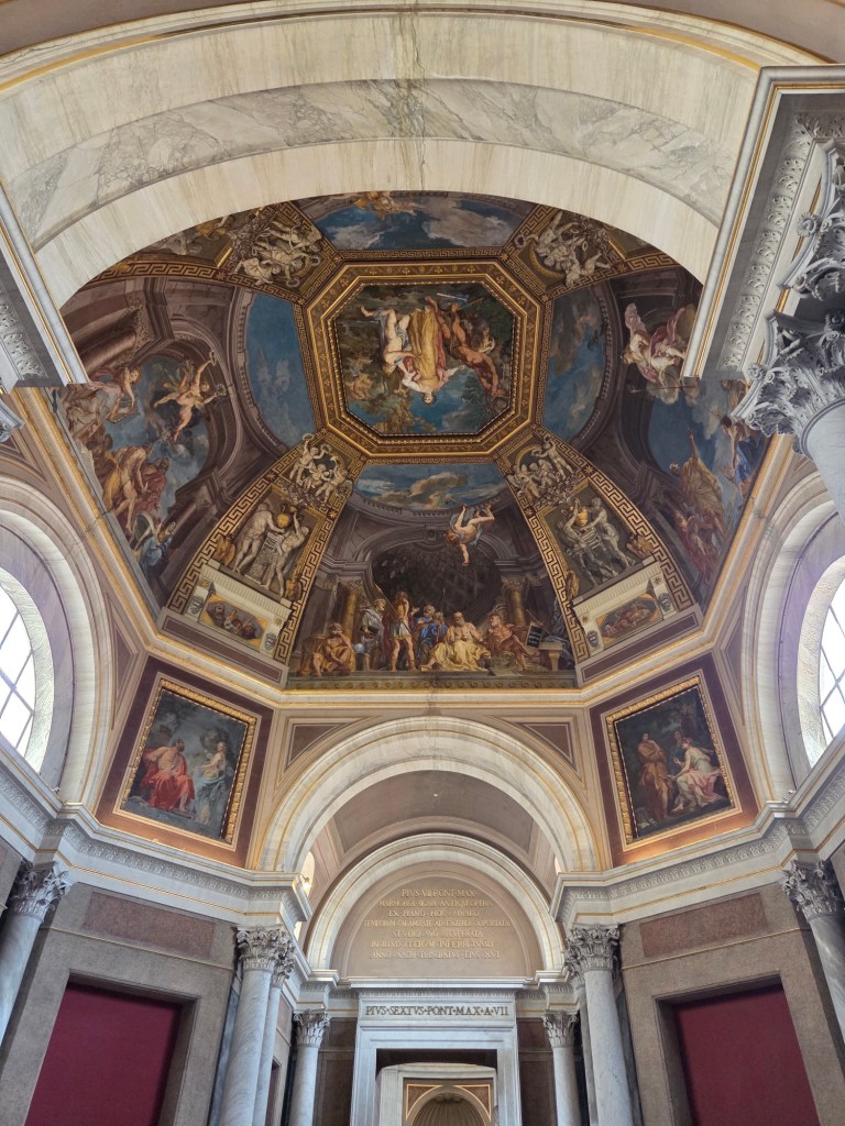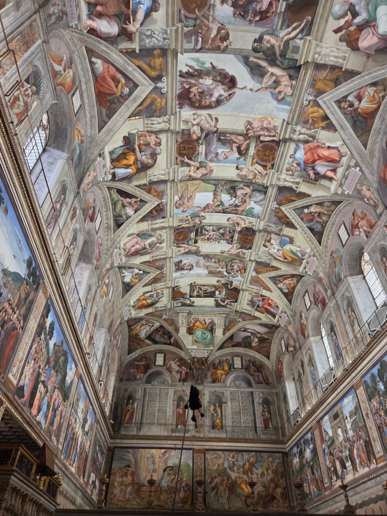 Vervolgens moesten we sprinten richting Vaticaanstad, want we hadden tickets voor het museum en de Sixtijnse kapel, maar deze waren voor het tijdslot van 13:30 tot 14:00. Dus met al onze bepakking zijn wij richting Vaticaanstad gegaan, hebben we daar onze spullen in een kluisje gedropt, veel rijen voorgedrongen en stonden we uiteindelijk om 13:58 binnen in het museum.