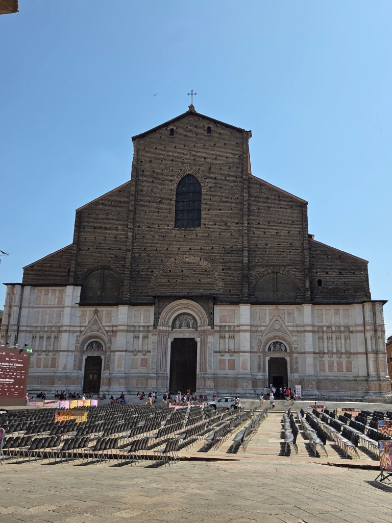 We begonnen onze tour in de bibliotheek. Deze heeft een erg mooi plafond en is gebouwd op een oud Romeins fort. Ze hebben glazen panelen in de bodem gebruikt, zodat je dit ook nog kan zien. Erg vet! Hierna gingen we naar twee van de kerken die hier staan. Ze hebben in Bologna namelijk niet een belangrijkste kerk, maar twee. Hierdoor waren ze ook allebei niet super indrukwekkend, eentje was zelfs officieel nog niet eens af!