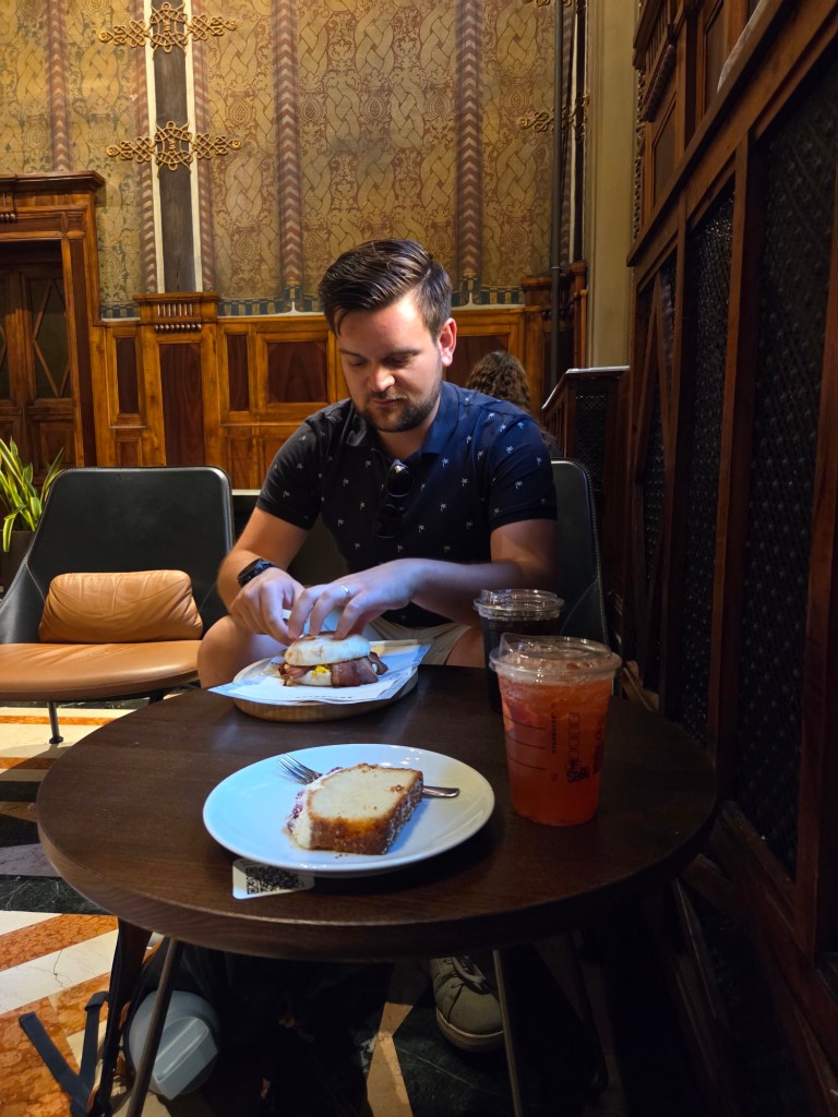 Toen was het tijd voor het belangrijkste van de dag, de souvenirsjacht. Aangezien er niet bijster veel herkenbare gebouwen waren besloten we er eentje te nemen met een van de lokale delicatessen, Mortadella. Voor degenenen die niet weten wat dat is, het is een worst met blokjes vet er in voor extra smaak. Yannick eet dit al de hele week op zijn brood en is hier groot fan van. Verder zijn we ook nog langs de Starbucks gegaan voor een espressokopje met een Italië print.