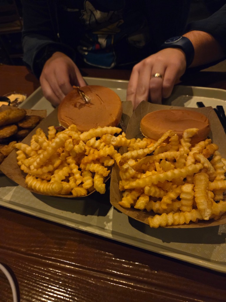 Inmiddels weer tijd om iets te eten en we gingen naar Grizzly Peak. Hier hadden we allebei een burger en frietjes en Yannick had daar nog wat gefrituurde augurken bij.