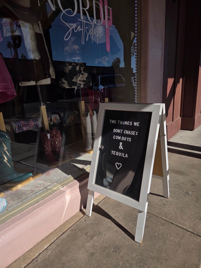 Toen was het tijd voor de giftshops, we moeten natuurlijk wel nog een magneetje voor op het bord. De vibes waren best wel cowboy/wilde westen wat veel sfeer gaf aan de winkels. We kwamen eerst bij een winkel waar allemaal small business een booth/tafel konden huren. Hier hebben we veel leuke stickers, sleutelhangers, kaarsen, kleding etc. gezien die lokaal handgemaakt worden. Een erg gezellig winkeltje, maar de magneet was nog niet gevonden. Gelukkig kwam er later in de straat nog een souvenirshop waar we wel slaagde. Na nog wat rond te wandelen kozen we weer voor de Waymo (zelfrijdende taxi) terug naar het hotel waar we onze auto weer pakte om Phoenix te verlaten.