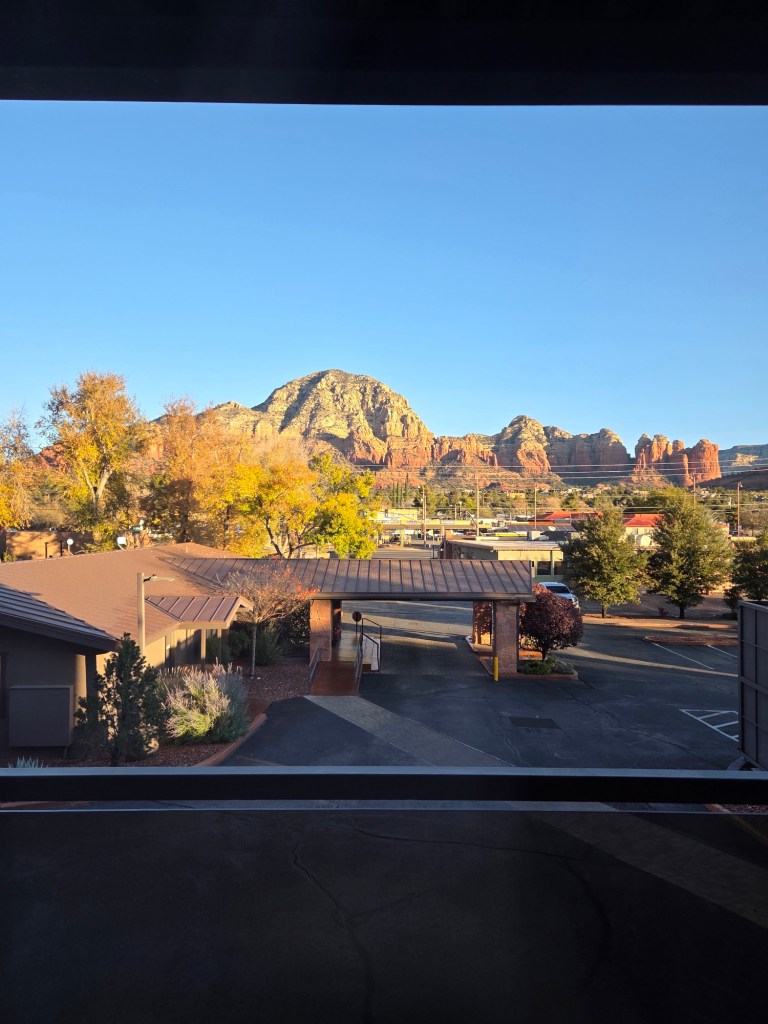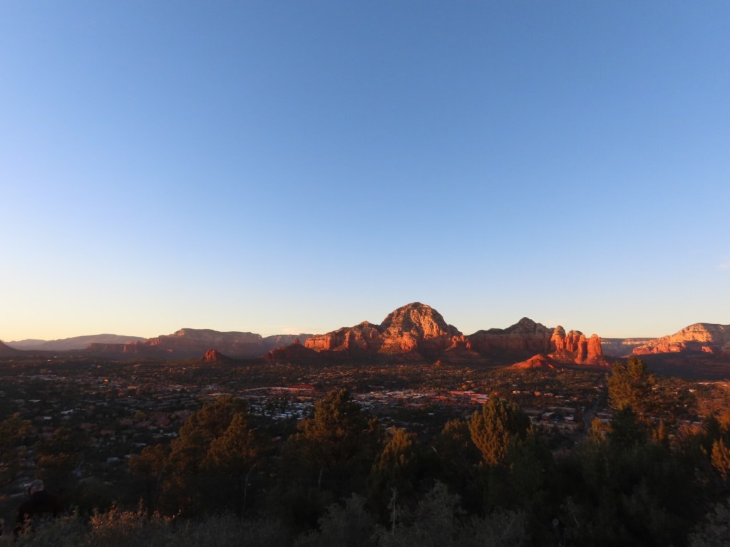 Na deze tocht waren de benen en voeten vrij moe geworden maar we wilden graag nog met zonsondergang bij Airport Mesa zijn. Dit is een uitzichtpunt wat hoger ligt, waardoor je prachtig uitkijkt over de bergen.