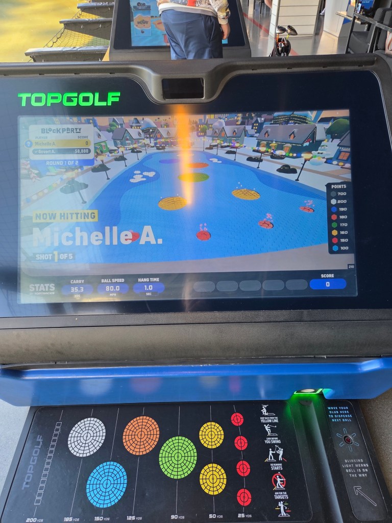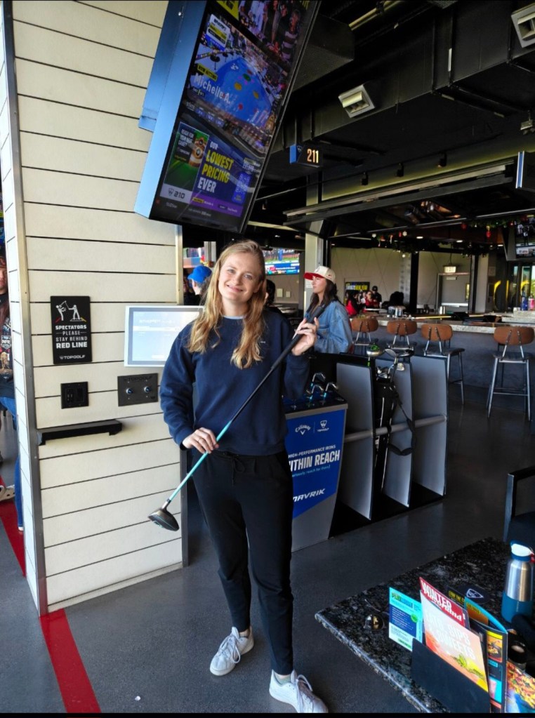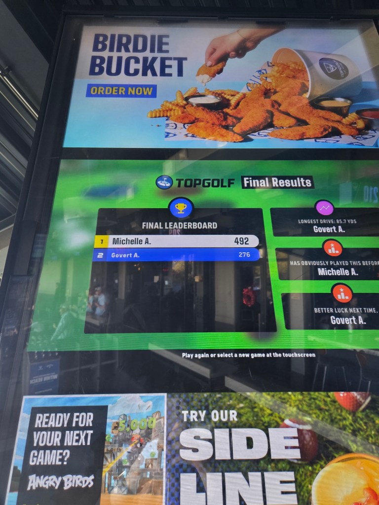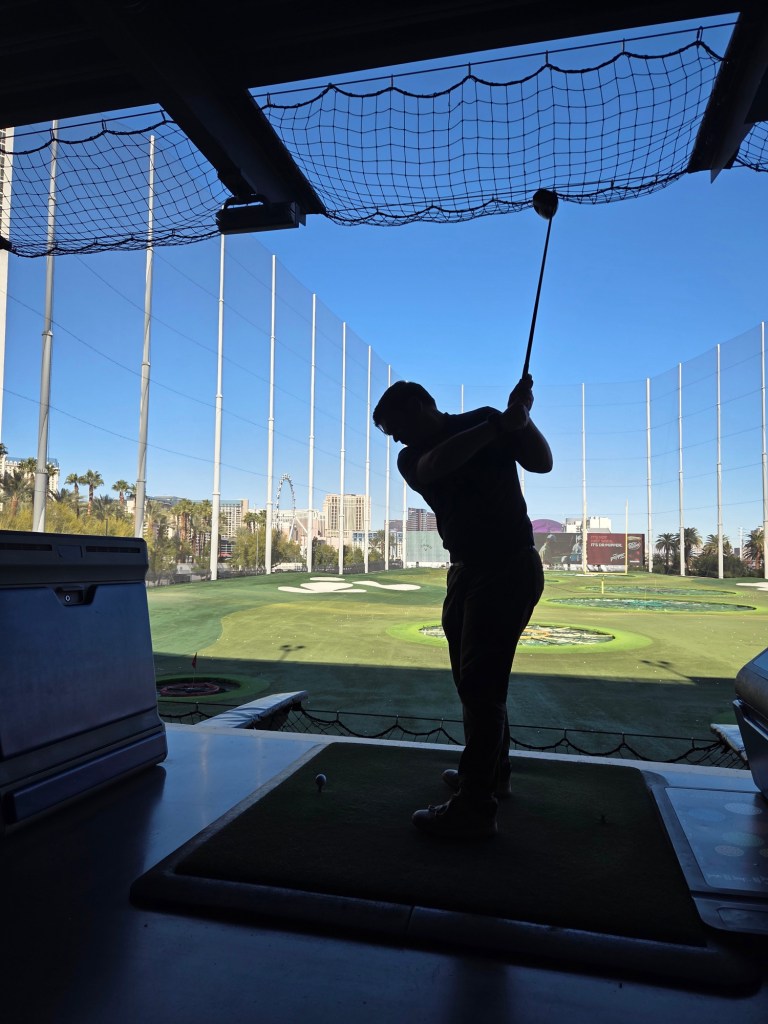Onze eerste stop vandaag is bij Topgolf, vlakbij de strip. Hier gaan we een uurtje ballen slaan. Het is niet zomaar ballen slaan, maar er zitten verschillende spelletjes achter. Wanneer je een golfbal slaat wordt hij getrackt en kun je dus virtuele targets raken. Voordat we begonnen kregen we nog even een korte uitleg en kreeg Yannick z’n eigen linkshandige clubs.